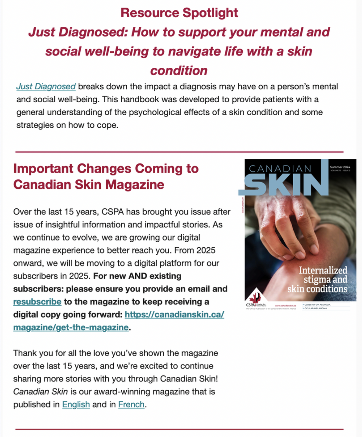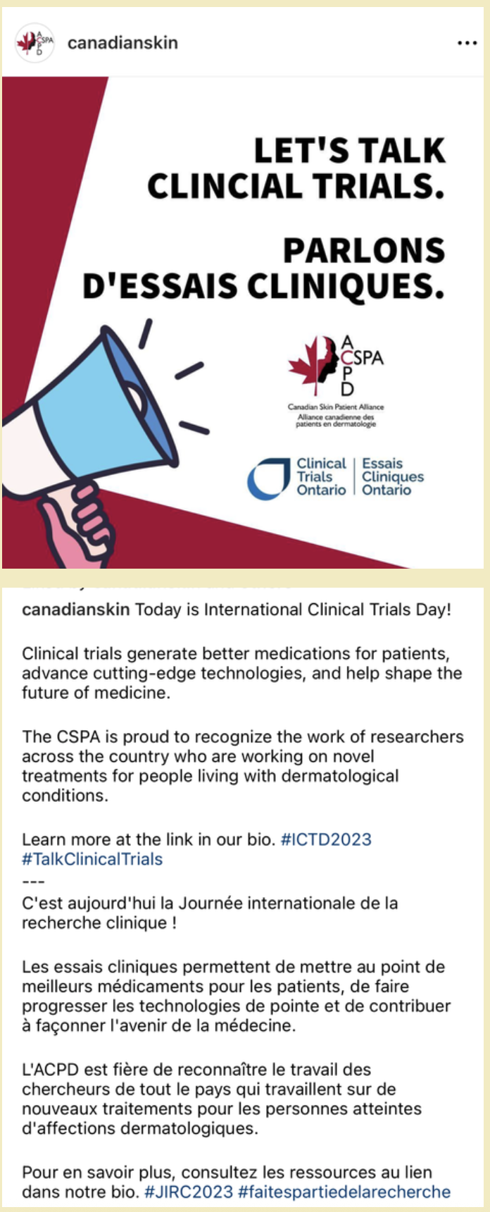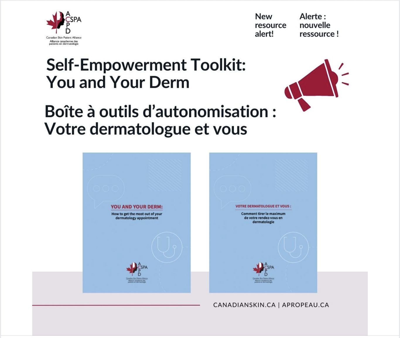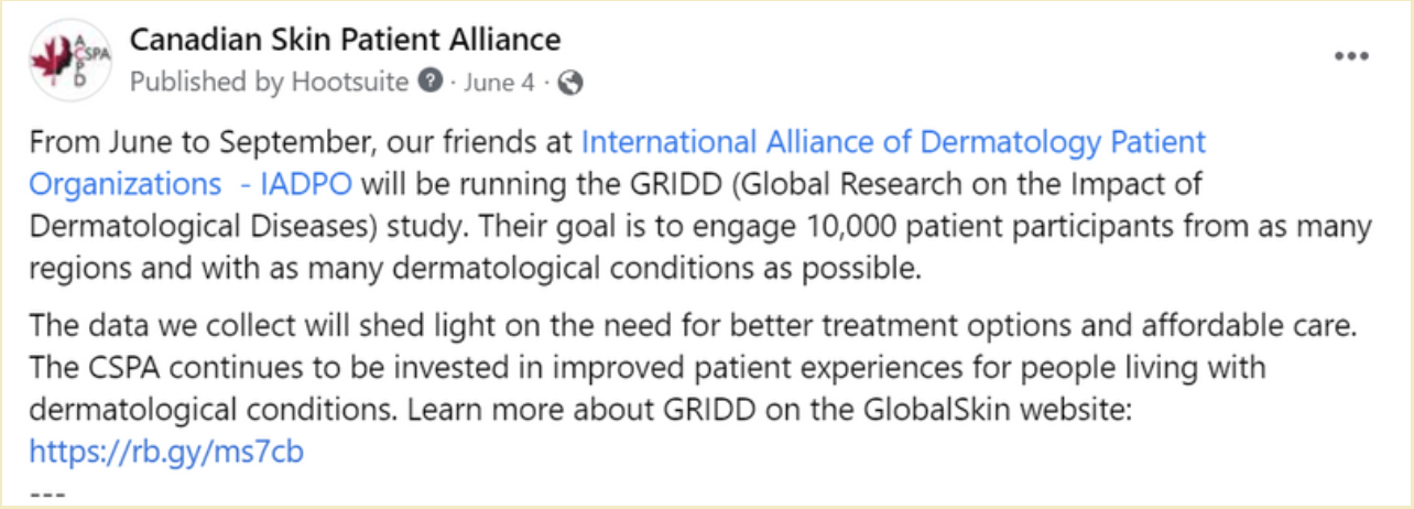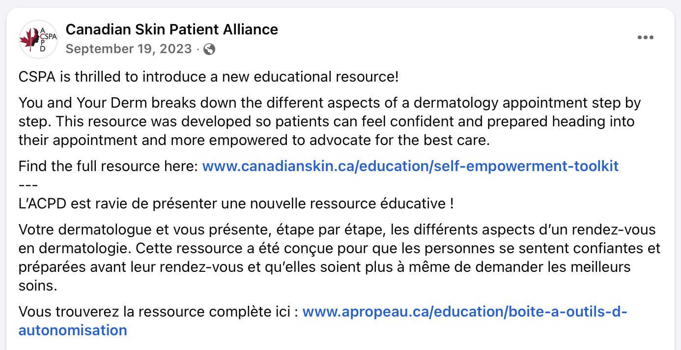 The Canadian Skin Patient Alliance is an NGO which helps people impacted by skin, hair, and nail conditions live healthier lives.